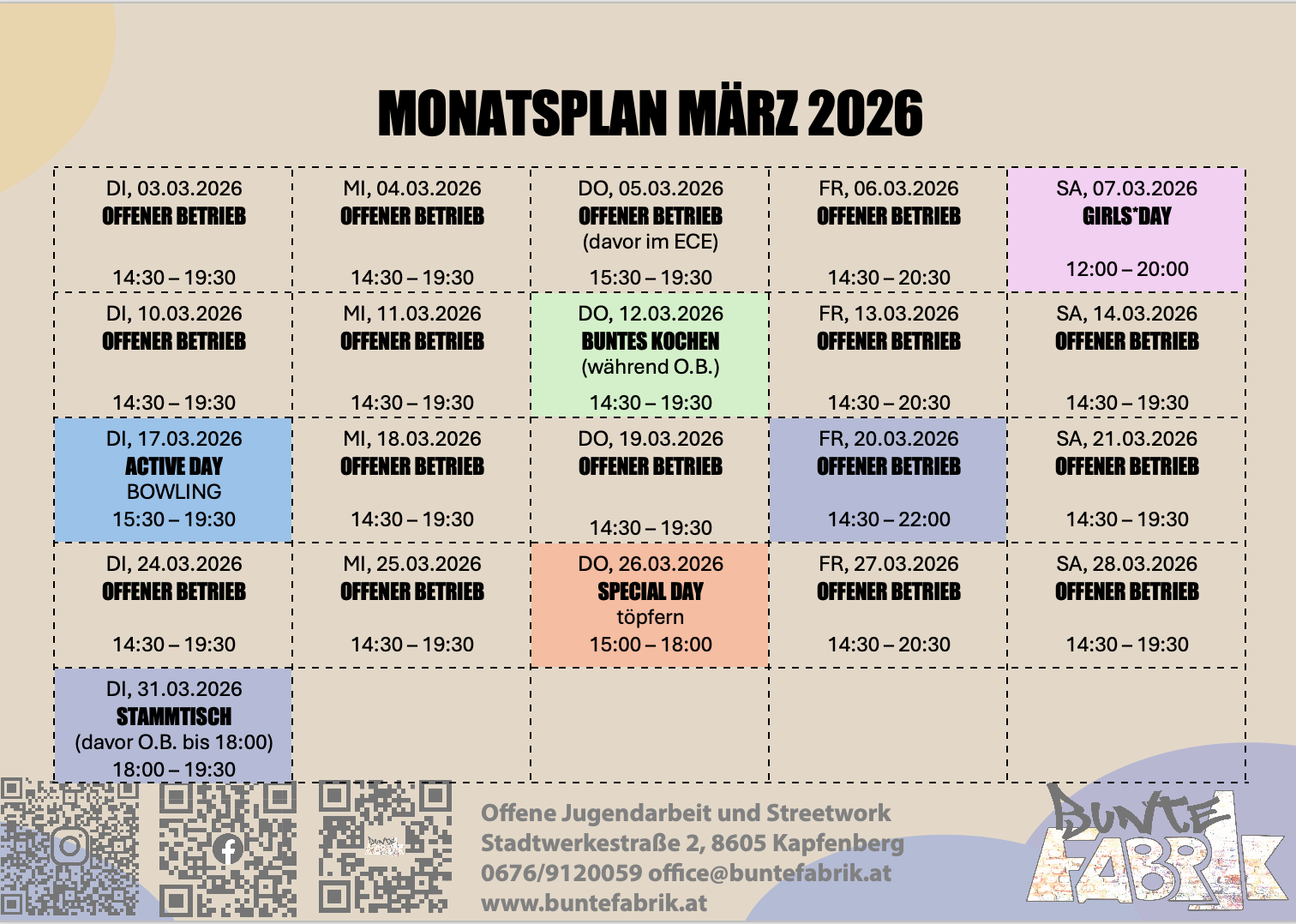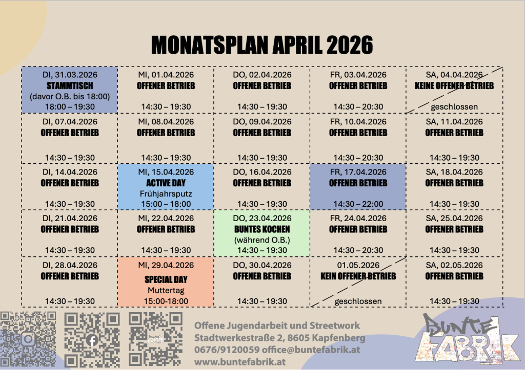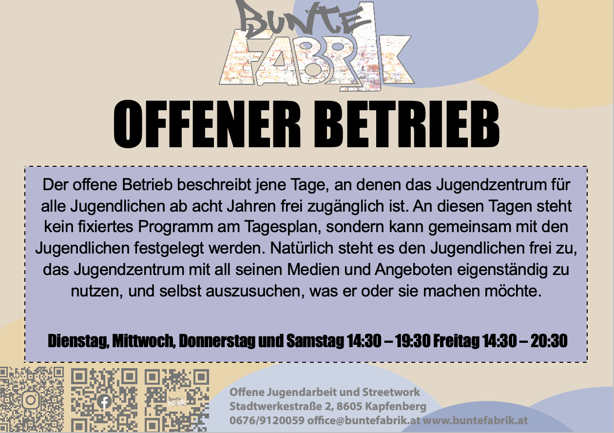 Die Bunte Fabrik ist seit 1982 ein fester Bestandteil der Kapfenberger Jugend- und Kulturarbeit. An oberster Stelle steht das freizeitpädagogische Angebot, um den Jugendlichen ein aktives, selbstbestimmtes und lebensorientiertes Freizeitangebot zu schaffen.