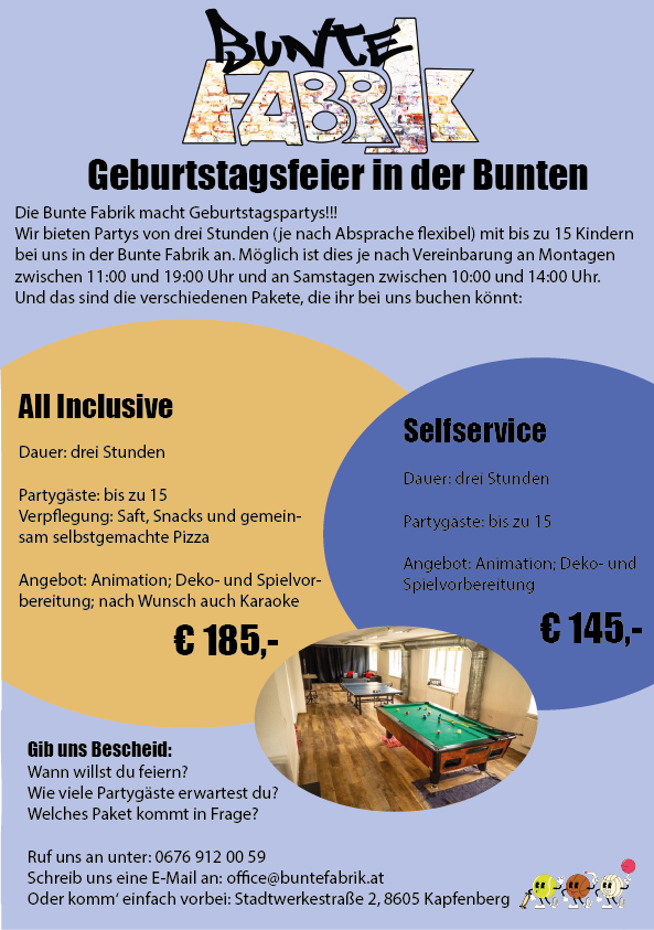 Das Jugendzentrum hat neben dem offenen Betrieb ebenfalls externe Angebote. Wie zum Beispiel den Active Day und den Active Day Kids wo wir zum Beispiel mit den Jugendlichen und Kindern in den Familypark fahren, ins Jump 25, oder auch in den Leopark. In enger Zusammenarbeit mit der Stadtgemeinde Kapfenberg sind wir auch Teil vom KIJUSO (Kinder und Jugendsommer). Die verschiedenen Angebote sind hier auf der Homepage ersichtlich. Wir bitten um rechtzeitige Anmeldungen, da die Angebote meistens bereits frühzeitig ausgebucht sind. Um am Laufenden zu bleiben, kann man sich gerne unserer Whatsapp-Broadcastliste anschließen. Gerne eine SMS mit „Bitte in die Broadcastlist aufnehmen“ an 0676/9120059 senden.